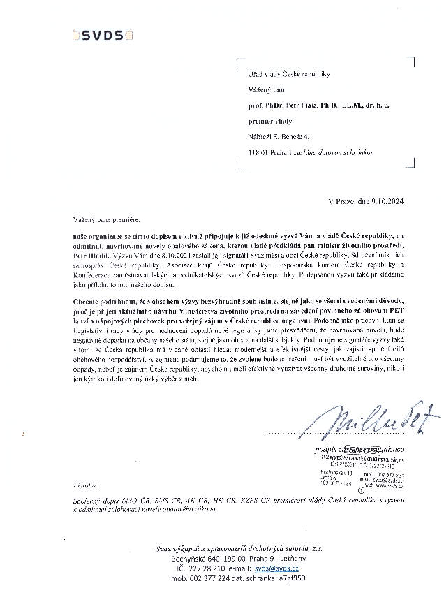 Dne 9.10.2024, se SVDS připojil k výzvě Odmítnutí návrhu novely obalového zákona.