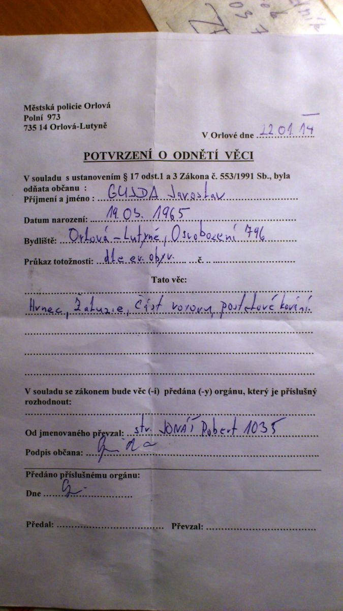 A přiložili doklad (čtěte zde) coby svědectví o profesonálním zákroku střážníka při ochraně majetku. Doklad sám o sobě o profesionalitě strážníka vypovídá spíše o tom, že onen iniciativní strážník má nemalé problémy s vyplněním vlastního formuláře, ale v této souvislosti, i když zatím nemám další informace na jejichž získání již pracuje náš právník, připomínám, že všchni naši členové byli podrobně instruování jak si v takovém případě počínat a tvrdě a korektně si stát na svém. I když tento první výstřelek je spíše úsměvný, zejména pro řadu právních pochybení a seznam odňatých předmětů, zřejmě se v Orlové-Lutyni rozhodli vyzkoušet "co to udělá". Ale na druhou stranu, představa ověnčeného strážníka hrncem a dalším, evidentně domácím kovovým šrotem, jak spěchá se zalíbit starostovi, také není k zahození. Třeba jako scéna pro další Troškův film.